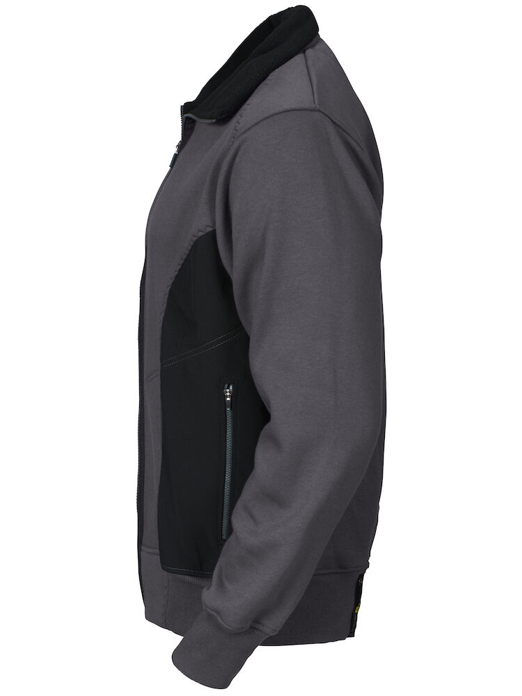 Sweatjacke mit Stehkragen, durchgehendem Reissverschluss in Kontrastfarbe und Ziernähten. Seitentaschen mit kontrastierendem Reissverschluss und Softshell Verstärkungen in der Seitenpartie. Strickbündchen an den Ärmelenden und am Bund.