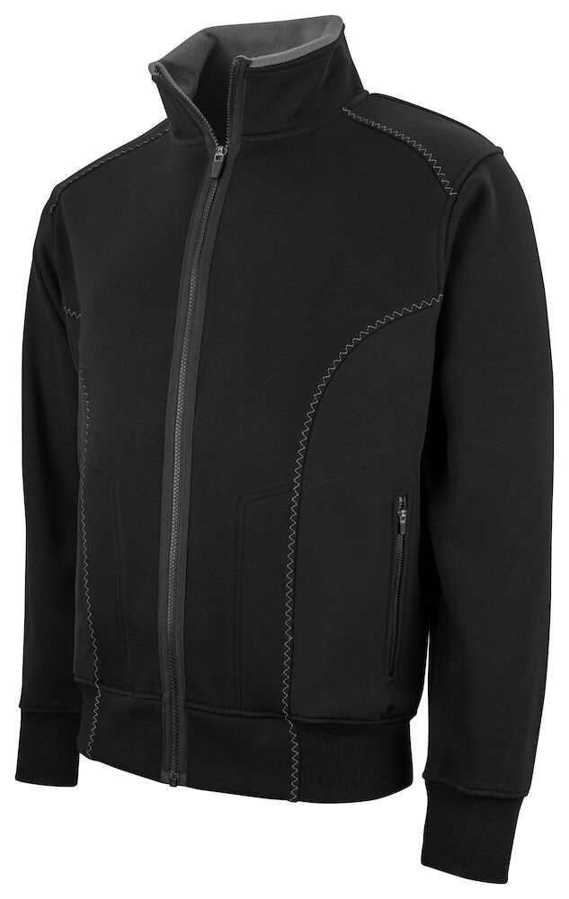 Sweatjacke mit Stehkragen, durchgehendem Reissverschluss in Kontrastfarbe und Ziernähten. Seitentaschen mit kontrastierendem Reissverschluss und Softshell Verstärkungen in der Seitenpartie. Strickbündchen an den Ärmelenden und am Bund.