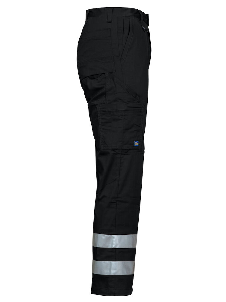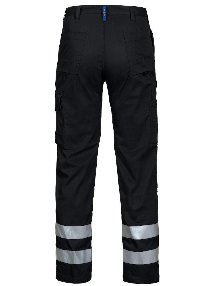 Gerade geschnittene Arbeitshose ohne Bundfalte. Zwei tiefe Fronttaschen mit Seiteneingriff und Sicherheitstasche mit Reissverschluss auf der rechten Seite. Zwei aufgesetzte Gesässtaschen und zwei Beintaschen. Davon die linke Tasche mit Patte und innen liegender Handy Tasche. Die rechte Beintasche bietet Platz für Mobiltelefon, Schreibgeräte, Dokumente und Meterstab D-Ring für Schlüssel oder ID Karte. Knieprotektortaschen. Schlaufen unter den Gesäss- und Beintaschen.