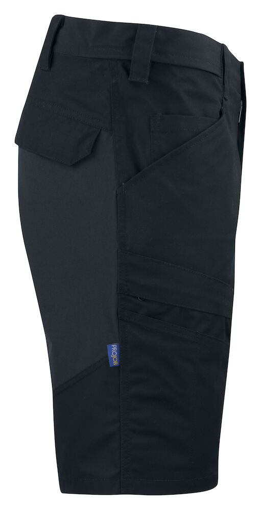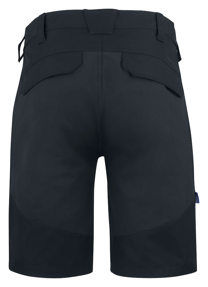 Modern geschnittene Shorts aus Stretchmaterial im Gesäss- und im Schrittbereich. Zwei vordere Jeanstaschen. Zwei Beintaschen auf den Oberschenkeln mit Reissverschluss und zwei nach innen eingearbeitete Gesässtaschen mit Klettverschluss Patte. Keine Metertasche. Verdeckter Knopfverschluss vorne. Vorbereitungen für Hängetaschen (optional Erhältlich PJ 9042).