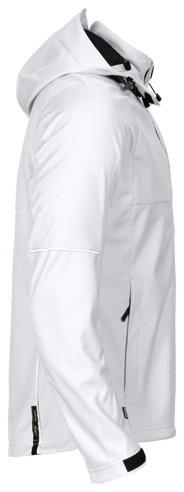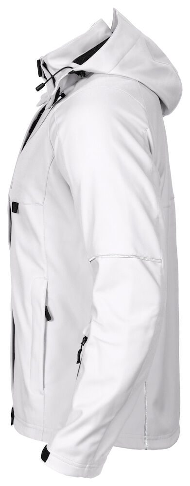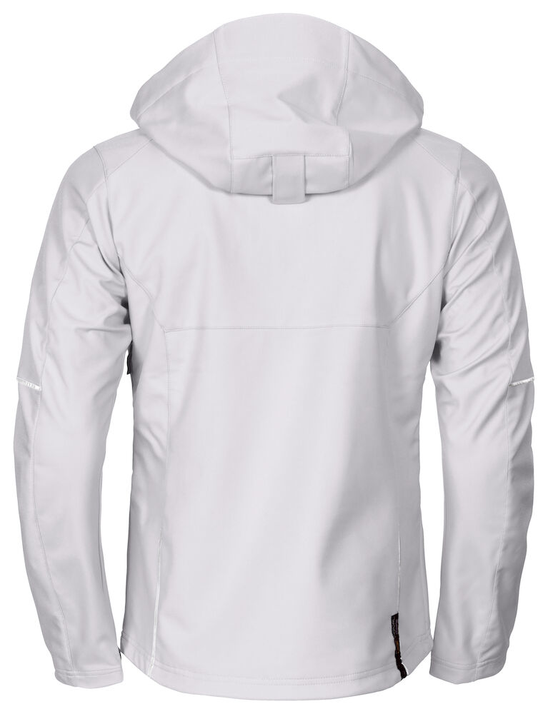 3 lagige, wind- und wasserabweisende Softshell Jacke. Zwei Brusttaschen, die linke mit Handyfach innen. ID-Kartenhalter. Zwei Seitentaschen mit Reissverschluss und eine Ärmeltasche links. Innentasche mit Öffnung für Kopfhörer. Belüftungsreissverschlüsse unter den Armen. Kordelzug im Bund und verstellbare Ärmelbündchen. Verlängerter Rücken und Reflektorpaspeln an Ärmeln und Rücken. Einstellbare, abnehmbare Kapuze. Kragen mit Fleecefutter.