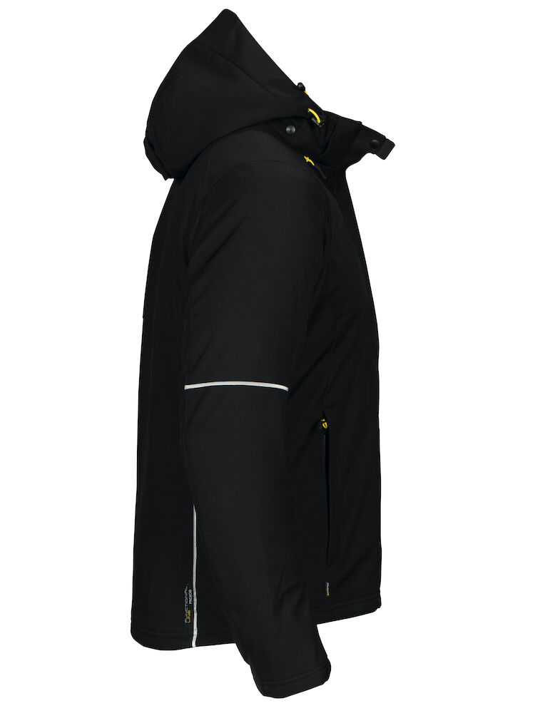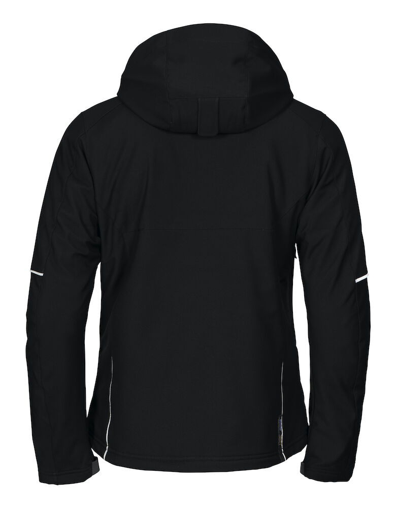 3 lagige, wind- und wasserabweisende Softshell Jacke mit Steppfutter für kalte Arbeitstage. Zwei Brusttaschen, die linke mit Handyfach innen. ID-Kartenhalter. Zwei Innentaschen mit Reissverschluss, eine davon grosse genug für Dokumente etc. Zwei Seitentaschen mit Reissverschluss und eine Ärmeltasche links. Innentasche mit Öffnung für Kopfhörer. Belüftungsreissverschlüsse unter den Armen. Kordelzug im Bund und verstellbare Ärmelbündchen. Verlängerter Rücken und Reflektorpaspeln am Rücken und den Ärmeln. Einstellbare, abnehmbare Kapzuze. Fleecefutter im Kragen und in den Seitentaschen.