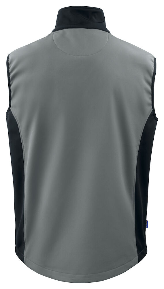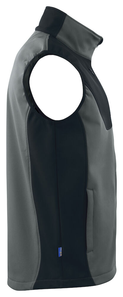 Atmungsaktive Softshell Weste mit Kontrastelementen an den Seiten und um die rechts angebrachte Brusttasche. Zwei Seitentaschen und auch die Brusttasche mit Reissverschluss. Erhöhter Kragen und durchgehender Reissverschluss mit Kinnschutz. Justierbar im Taillenbereich.
