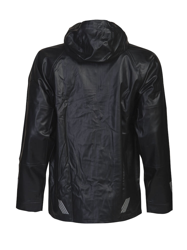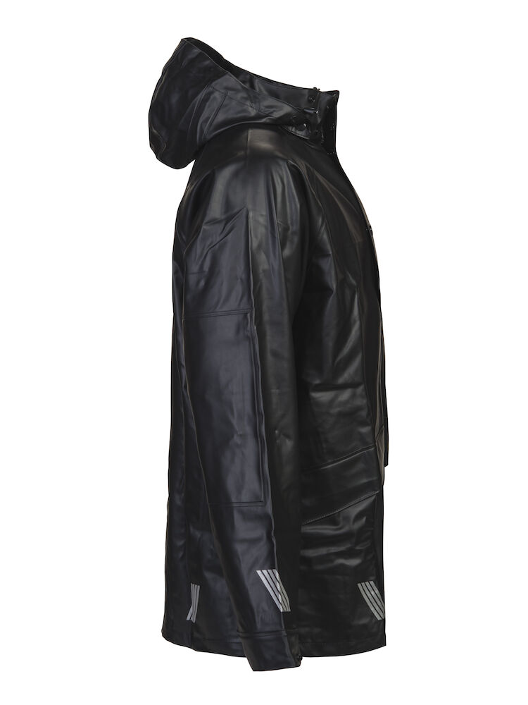Jacke mit verschweissten und abgedeckten Nähten. Abnehmbare und verstellbare Kapuze mit Druckknöpfen. Ärmelbündchen mit Druckknöpfen verstellbar. Fronttaschen mit Klappe. Reflektoren an den Ärmelabschlüssen und am Bund.