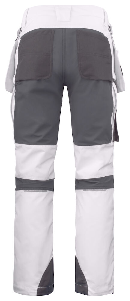 Modern geschnittene Bundhose mit Stretchmaterial am Gesäss, Schritt und Kniekehle. Wiederstandsfähiger Stretch CORDURA im Kniebereich. Belüftungsöffnungen entlang des Beines. Vorgeformte Knie. Knieprotektortaschen mit Öffnungen auf der Innenseite des Hosenbeins mit 2-facher Verstellmöglichkeit. Zwei Beintaschen: die Rechte mit Metertasche und die Linke für Werkzeug. Zwei Gesässtaschen. 2 abnehmbare Hängetaschen. DWR-C6 beschichtet, so dass das Material wasser-, staub- und schmutzabweisend ist.