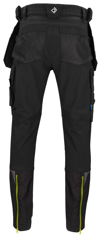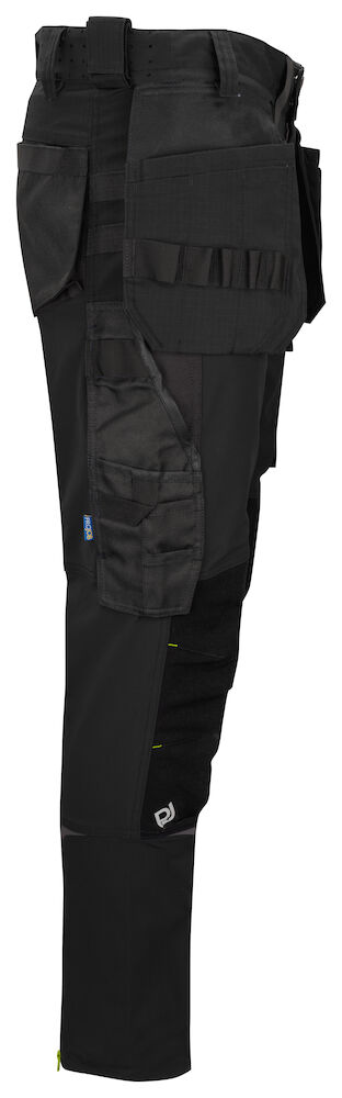 Schmal (Slim Fit) geschnittene Full Stretch Arbeitshose mit Hängetaschen in Ripstop Polyester Baumwollmischung. 4-Wege Stretch im Gesäss- , Schritt- und Oberschenkelbereich; 2-Wege Stretch in der Kniekehle und im Wadenbereich. Lüftungsöffnungen mit Reissverschluss und Mesh entlang beider Beine. Elastischer Mesheinsatz am Hosenbund erhöht den Tragekomfort. Zwei Hammerschlaufen. Linkes Bein eine Cargotaschen mit Unterteilungen für Schreibutensilien und Handy mit Magnet verschliessbar; am rechten Bein eine aufgenähte Metertasche mit weiteren Unterteilungen für Werkzeug. Reflektierende Details für erhöhte Sichtbarkeit in der Dunkelheit. Regulierbare Beinabschlüsse. Vorgeformte Knie sind mit DuPont® Stretch-Kevlar verstärkt. Hängetaschen und untere Innenseite der Beine sind mit Cordura® verstärkt. Gesässtaschen sind in Cordura® gearbeitet.