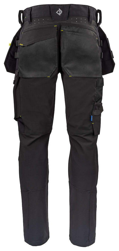 Modern geschnittene Bundhose aus vollem Stretch, die ein Maximum an Bewegungsfreiheit und Komfort bietet. Die Seiten am Bund sind nicht in Stretch, um der Hose Stabilität zu verleihen. Belüftung auf der Rückseite der Taille. Geräumige Beintaschen auf beiden Seiten. Linke Beintasche für Werkzeug und Stifte, ausserdem eine Handytasche mit Magnetverschluss und eine Halterung zur Befestigung ID Karte. Auf der rechten Seite Metertasche und Tasche für Werkzeug mit Messerknopf. Breitere Gürtelschlaufe auf der Rückseite, um Druck vom Gürtel zu vermeiden. Gesässtaschen aus Cordura®, eine mit Klappe und Magnetverschluss. Vorgeformte Knie. Innentaschen für Knieschützer, in zwei Höhen einstellbar. Holstertaschen, Beinabschlüsse und Knie sind mit Cordura® verstärkt, um die Haltbarkeit zu erhöhen. Möglichkeit zur Befestigung von MOLLE Systemen an beiden Seiten.