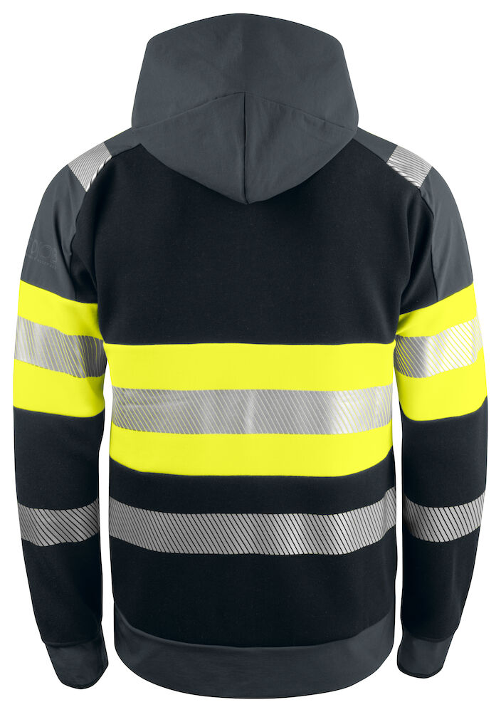 Modern geschnittene Warnschutz Kapuzenjacke aus einem funktionellen Material. Verstärkungen aus elastischem Softshell auf der Vorderseite. 4-Wege Stretch an den Schultern und an Kapuze. Reflektor Details an der Jacke. Seitliche Taschen mit kontrastfarbenen Zippern. Segmentierte Reflektorstreifen. Elastische