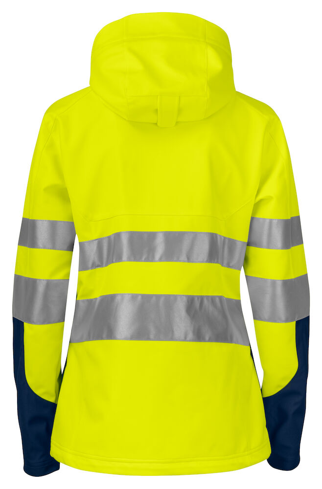 Warnschutz Damenjacke aus wind- und wasserabweisendem, weichem Softshell Material. Zwei Brusttaschen mit wasserabweisendem Reissverschluss, links mit Mobiltelefon Innentasche. Schlaufe für ID-Kartenträger. Zwei Seitentaschen. Eine Tasche am linken Ärmel. Innentasche mit Öffnung links für Kopfhörer. Reissverschlüsse an den Achseln. Taillenweite mit Kordelzug verstellbar. Ärmelbündchen mit Klett verstellbar. Rückenverlängerung für erhöhten Komfort. Reflektierende Paspelierung an den Ärmeln und am Rücken. Abnehmbare und verstellbare Kapuze. Fleecegefütterter Kragen für erhöhten Komfort. Auch als Herren Jacke PJ 6419 verfügbar.