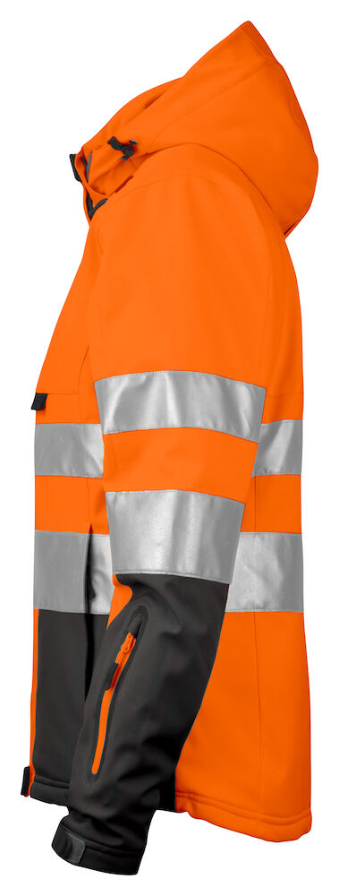 Gefütterte Warnschutz Damenjacke aus wind- und wasserabweisendem, weichem Softshell Material. Zwei Brusttaschen mit wasserabweisendem Reissverschluss, links mit Mobiltelefon Innentasche. Schlaufe für ID-Kartenträger. Zwei Innentaschen mit Reissverschluss, davon eine breitere für Dokumente usw. Zwei Seitentaschen mit Reissverschluss. Eine Tasche am linken Ärmel. Innentasche mit Öffnung links für Kopfhörer. Reissverschlüsse an den Achseln. Taillenweite mit Kordelzug verstellbar. Ärmelbündchen mit Klett verstellbar. Rückenverlängerung für hohen Komfort. Reflektierende Paspelierung an den Ärmeln und am Rücken. Abnehmbare und verstellbare Kapuze. Fleecegefütterter Kragen und fleecegefütterte Innentaschen für erhöhten Komfort. Auch als Herren Jacke PJ 6420 verfügbar.