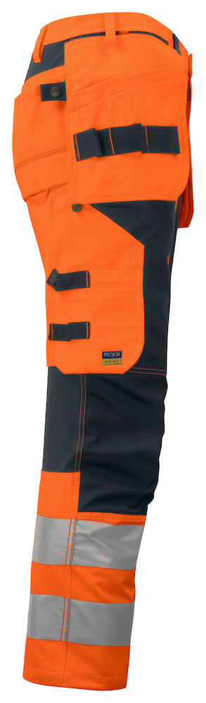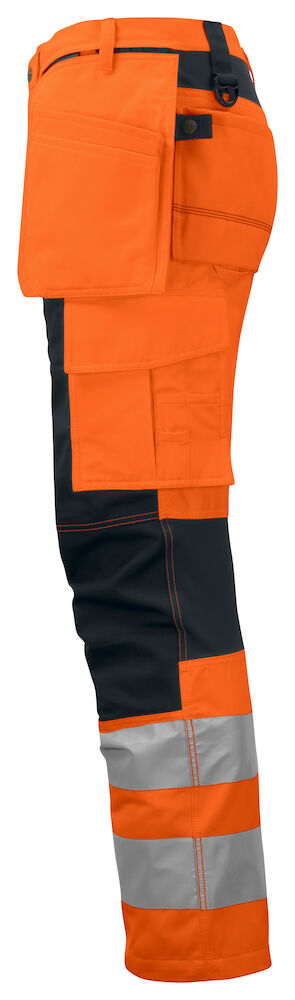Modern geschnittene Warnschutz Hose mit Cordura® Stretchmaterial im Schritt, Kniekehle und unter dem Rückenfutter. Zwei freihängende, mit 100% Cordura® verstärkte und abnehmbare Hängetaschen eine mit zusätzlichen Taschen und eine mit Werkzeugschlaufen. Doppellagiger Stoff auf der Oberschenkelpartie. Links Beintaschen, eine für Mobiltelefon, eine für Schreibgeräte und Werkzeugtasche. Zwei verstellbare Hammerschlaufen rechts am Bein. Auch rechts am Bein aufgesetzte Tasche für Meterstab mit Werkzeugtasche und Messerknopf. Knieverstärkungen aus Cordura mit Öffnung auf der Innenseite, höhenverstellbarer Knieschutz. Vorgeformte Kniepartien. Hinteres Beinende mit Cordura verstärkt. Extragrosse Gesässtaschen. Fluoreszierende Bereiche sind DWR-C6 beschichtet, so dass das Material wasser-, staub- und schmutzabweisend ist.
