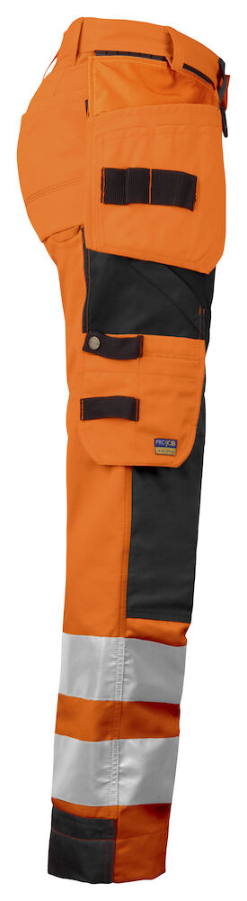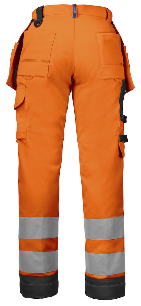 Modern geschnittene Arbeitshose für Damen. Zwei freihängende, abnehmbare Hängetaschen mit 100% Cordura® verstärkt; eine mit zusätzlichen Aufteilungen und eine mit Werkzeugschlaufen. Doppellagiger Stoff auf der Oberschenkelpartie. Linke Beintasche für Mobiltelefon, Schreibgeräte, Schlaufe für ID-Kartenhalter und Werkzeugtasche. Zwei D-Ringe. Rechte Beintasche für Meterstab und mit Aufteilungen für Werkzeug oder Schreibutensilien. Knieverstärkungen aus Cordura mit Öffnung auf der Innenseite, höhenverstellbarer Knieschutz. Vorgeformte Kniepartien. Hinteres Beinende mit Cordura verstärkt. Extragrosse Gesässtaschen. Fluoreszierende Bereiche sind DWR-C6 beschichtet, so dass das Material wasser-, staub- und schmutzabweisend ist. Alle Grössen um bis zu 5 cm verlängerbar.