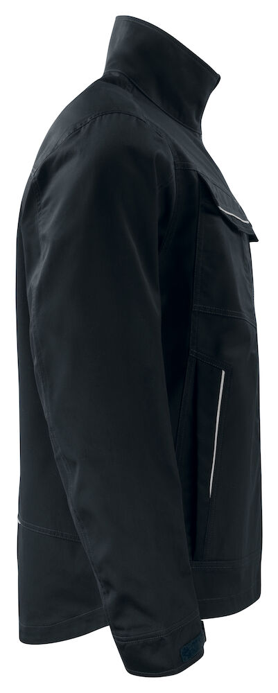 Strapazierfähige Service Jacke aus Polyester Baumwoll Mischgewebe mit Kontrast- und Reflektionselementen an den Seitenpartien, den Aussentaschen und dem Rücken. Zwei Brust- und zwei Seitentaschen mit verstärkten Kanten aus Polyamid. Hoher Kragen, durchgehender Reissverschluss mit Kinnschutz. Verlängerte Rückenpartie. Durch Klett justierbare Ärmelbündchen. Drei Innentaschen, eine davon mit Klett verschliessbar (z.B. fürs Telefon).