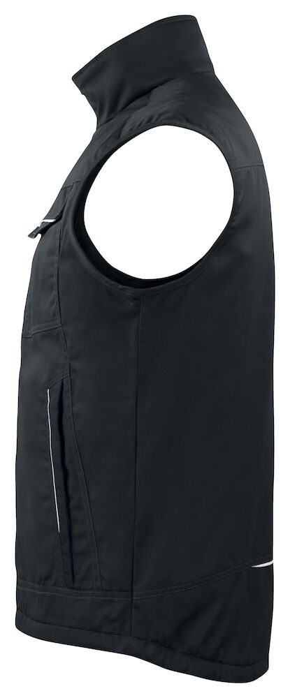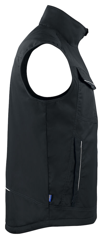 Gefütterte Weste aus Polyester Baumwoll Mischgewebe mit Kontrast- und Reflektionselementen an den Aussentaschen und dem Rücken. Zwei Brust- und zwei Seitentaschen mit verstärkten Kanten aus Polyamid. Hoher Kragen, durchgehender Reissverschluss mit Kinnschutz. Verlängerte Rückenpartie. Drei Innentaschen, eine davon mit Klett verschliessbar (z.B. für Telefon). Service Reissverschluss am Innenfutter für Besticken oder Bedrucken.
