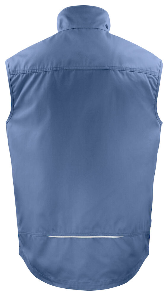 Weste aus Polyester Baumwoll Mischgewebe mit Kontrast- und Reflektionselementen an den Aussentaschen und dem Rücken. Zwei Brust- und zwei Seitentaschen mit verstärkten Kanten aus Polyamid. Hoher Kragen, durchgehender Reissverschluss mit Kinnschutz. Verlängerte Rückenpartie. Drei Innentaschen, eine davon mit Klett verschliessbar (z.B. für Telefon).