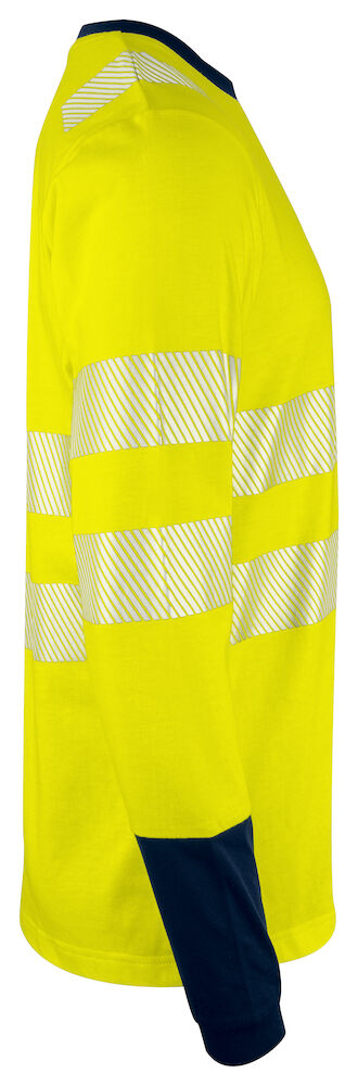 Langarm T-Shirt aus Polyester Baumwolle Mischgewebe, das ein tolles Gefühl von Baumwolle am Körper vermittelt. Kontrastfarbe am Ärmelende schützt gegen Dreck. Segmentierte Reflektoren von 3M.