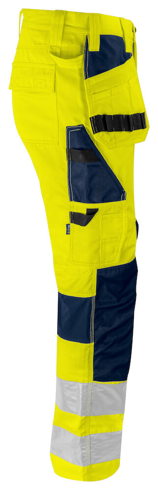 Bundhose mit grosser Flexibilität. Stretch Gewebe im Schritt und auf der Rückseite der Knie für mehr Komfort und Flexibilität. Holstertaschen, die in die Seitentaschen gesteckt werden können, auf der linken Seite, Tasche mit einer zusätzlichen Tasche und auf der rechten Seite Schlaufen für Werkzeuge und offene Taschen. Gesässtaschen mit Patte und Klettverschluss. Metertasche und Tasche für Werkzeuge mit Messerknopf. Zwei Hammerschlaufen, eine auf jeder Seite. Vorgeformte Knie mit Innentaschen für Knieschützer, in zwei Höhenstufen verstellbar. Verstärkungen in den Holstertaschen, der Zollstocktasche und über den Knien für erhöhte Haltbarkeit. Die Grössen C42-C64 können um 5 cm verlängert werden.