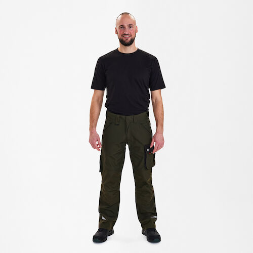 Die Hose ist mit ergonomisch geformten Knien ausgestattet und verfügt über viele praktische Taschen, einschliesslich einer Schenkeltasche mit Reissverschlusstasche. Zwei Einstellmöglichkeiten für Knieschutzkissen, sowie Verstärkungen aus CORDURA® an den Knien und dem unteren Saum, bieten zusätzlichen Schutz und Haltbarkeit. Die Schenkeltasche hat einen freihängenden Boden und eine integrierte Zollstocktasche. Eine Schlaufe mit D-Ring rundet die Funktionalität ab. Die Hose ist für Industriewäsche geeignet und besteht aus 22 recycelten Plastikflaschen.