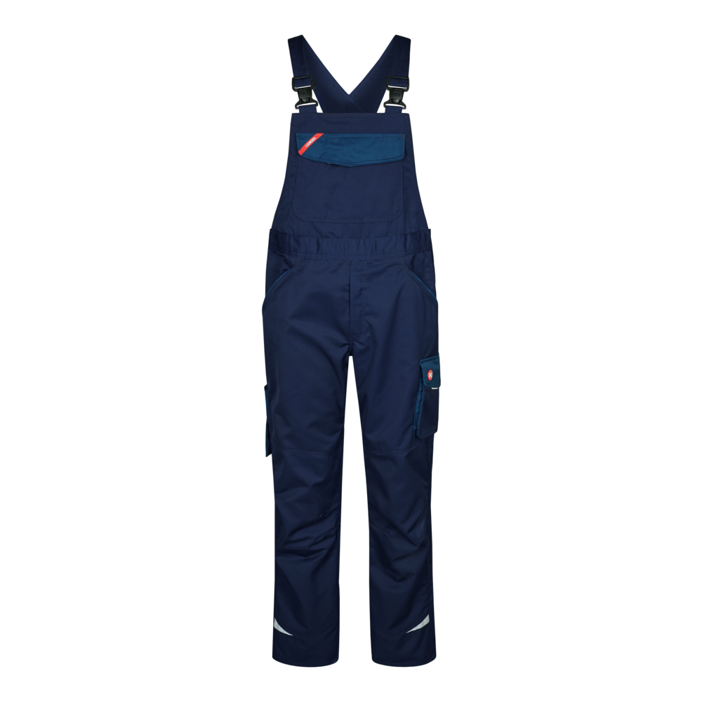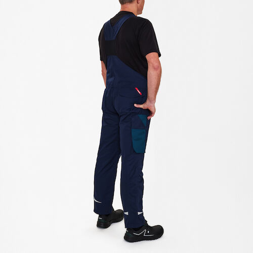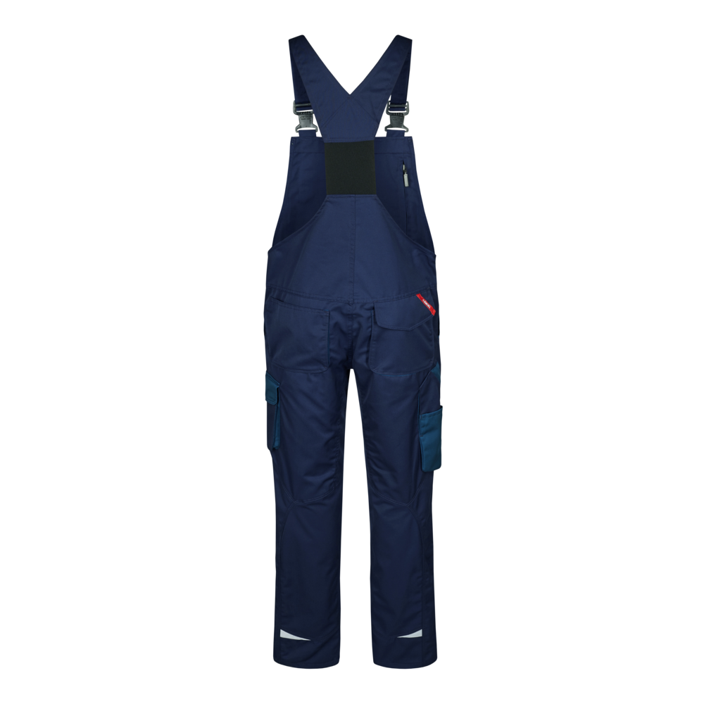 Eine Schlaufe mit D-Ring und die freihängende Zollstocktasche erhöhen die Funktionalität dieser Hose. Für mehr Sichtbarkeit sorgen die Reflexapplikationen unten an den Hosenbeinen. Die Latzhose ist für die Industriewäsche geeignet und bleibt dadurch pflegeleicht und langlebig.