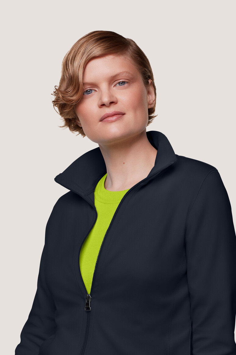 Diese komfortable Damen-Interlockjacke zeichnet sich durch einen hochwertigen YKK-Frontreissverschluss und formstabile Bündchen mit LYCRA-Anteil aus. Teilungsnähte mit dekorativer Flatlocksteppung und zwei seitliche Eingrifftaschen sorgen für zusätzliche Funktionalität und modische Akzente. Die Jacke besteht aus weichem, elastischem Interlock aus langstapeliger, gekämmter und ringgesponnener Baumwolle.