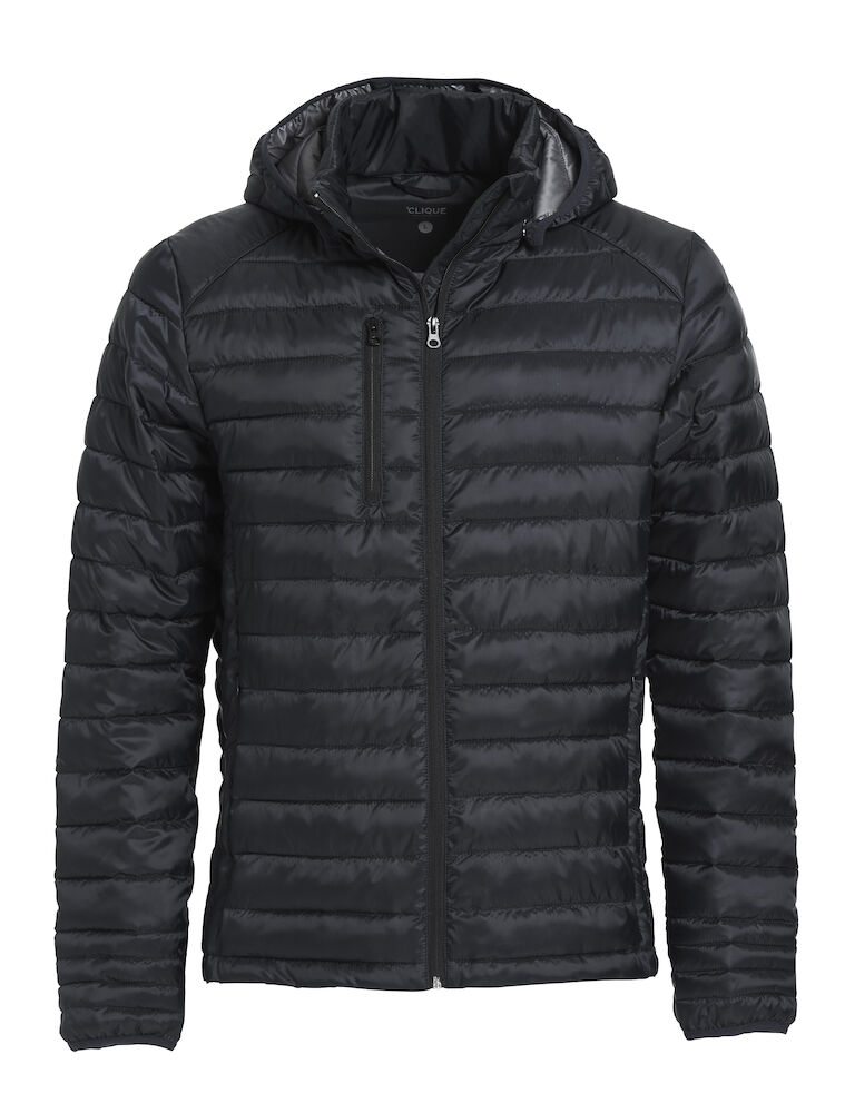 Moderne Steppjacke mit daunenähnlicher Wattierung. Drei Aussentaschen mit Reissverschlüssen und Kopfhörerführung Innen, die Kapuze ist abnehmbar. Elastischer Abschluss an den Ärmeln.