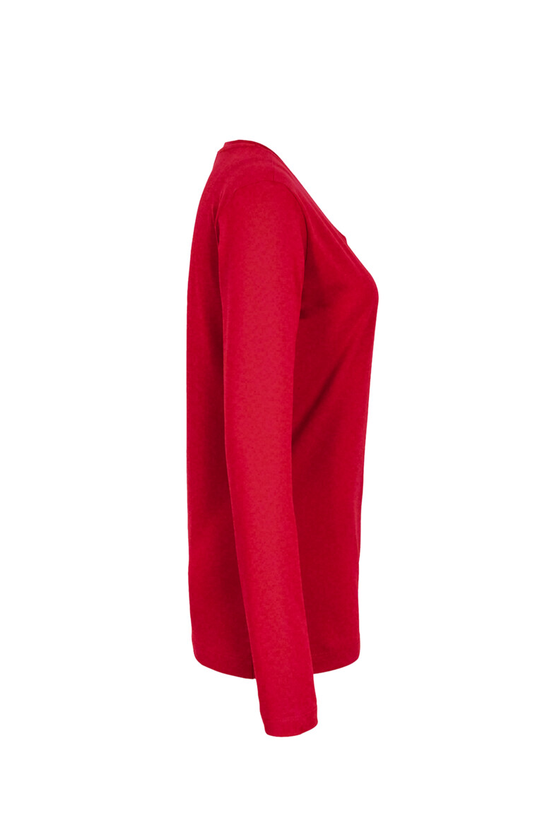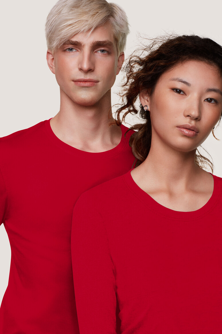 Feminin geschnittenes Langarmshirt mit rundem Halsausschnitt und modisch schmalem Halsbündchen sowie Nackenband. Hergestellt aus feinem, mittelschwerem Single-Jersey aus langstapeliger, gekämmter und ringgesponnener CmiA-Baumwolle.