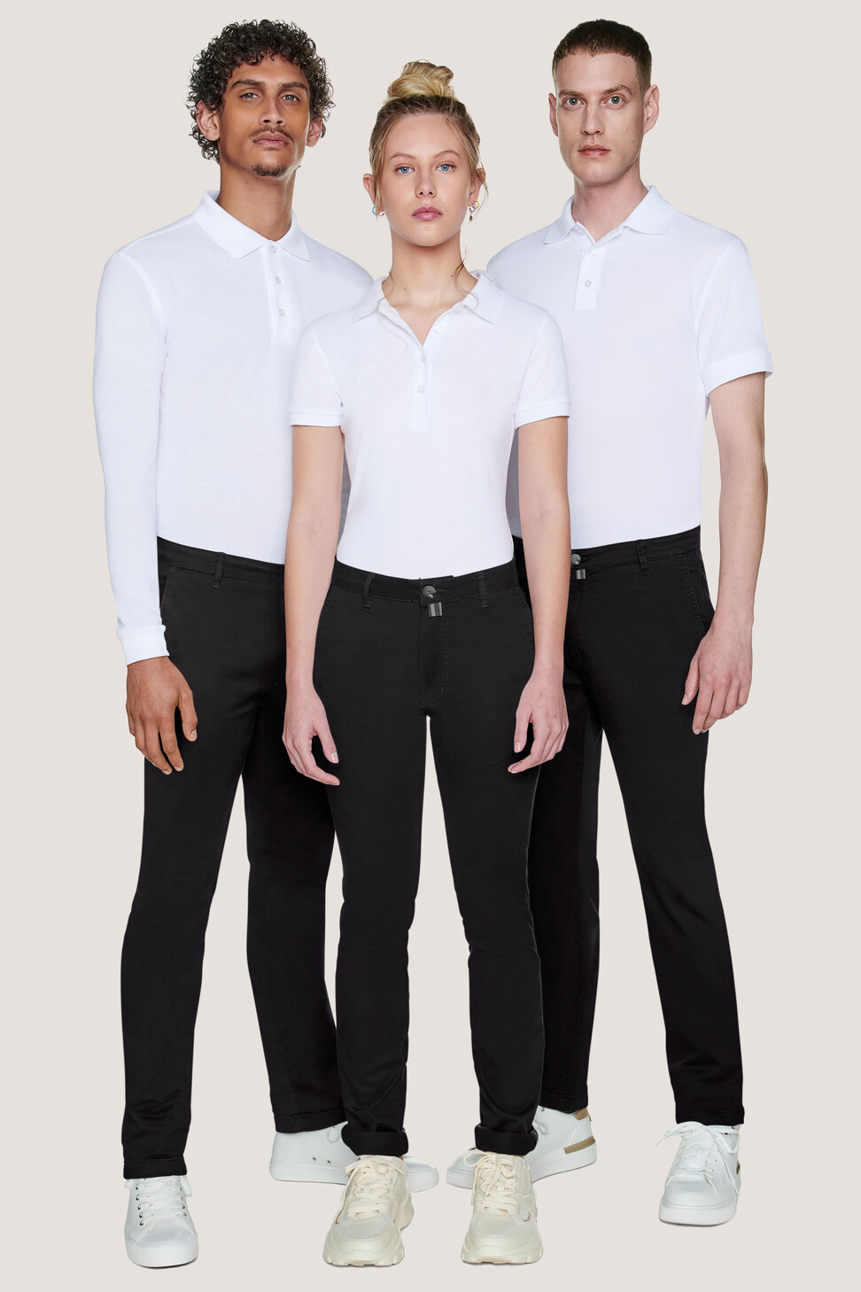 Diese sportlich legere Stretch-Chinohose bietet höchsten Tragekomfort und ist dabei strapazierfähig und pflegeleicht. Sie verfügt über zwei Eingrifftaschen vorne, zwei Paspeltaschen hinten mit Knopfverschluss, Gürtelschlaufen und einen YKK-Reissverschluss. Extra haltbare Knöpfe in Hornoptik mit gelasertem HAKRO-Schriftzug und ein Ersatzknopf unterstreichen die hochwertige Verarbeitung. Die Seitennähte am Saumende sind mit Futter gepolstert, so dass die Hose auch gekrempelt getragen werden kann. Der Ton-in-Ton gestickte HAKRO Dot unter der linken Tasche und die "HT. SEIT 1969" auf der Unterseite des Reissverschlusses verleihen der Hose besondere Akzente. Ein gewebtes HAKRO-Label aus hochwertigem Kettsatin mit weichen, ultraschallgeschnittenen Bandkanten am Innenbund sorgt für höchsten Tragekomfort.