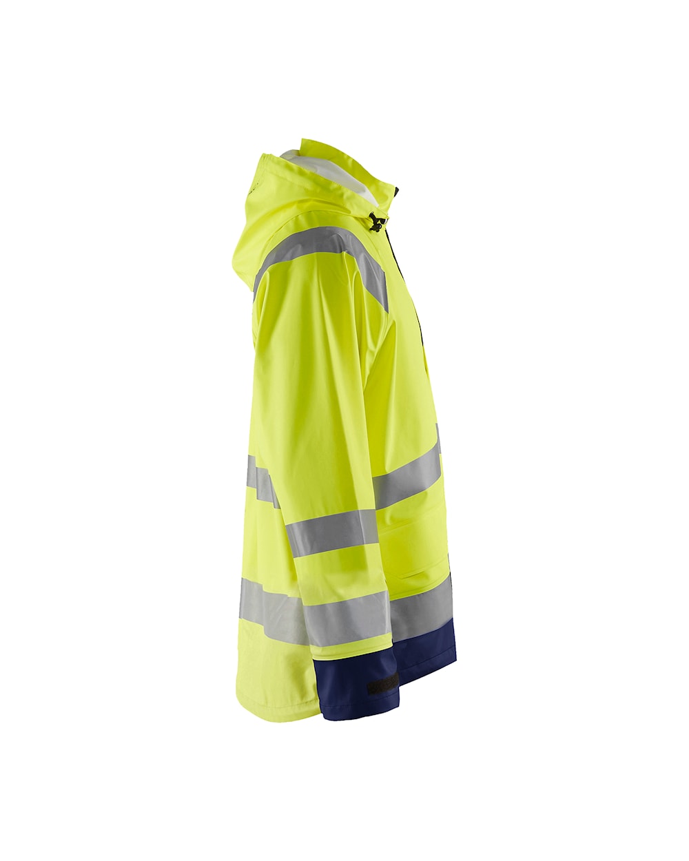High Vis Regenjacke mit verlängertem Rücken. Diese leichte Regenjacke bietet hohe Sichtbarkeit am Arbeitsplatz wenn nasses Wetter und schlechte Sichtbarkeit die Arbeitsbedingungen erschweren. Das Material ist fest und haltbar und dennoch leicht, wind- und wasserdicht mit verschweißten Nähten. Die jacke hat einen verlängerten Rücken, einen einstellbaren Saum, leicht zugängliche Vordertaschen mit Patte und Ärmelbündchen mit Klettverschluss. Zertifiziert nach EN 343, Schutzkleidung gegen schlechtes Wetter und EN ISO 20471, Klasse 3, Schutzkleidung mit hoher Sichtbarkeit.Stoff