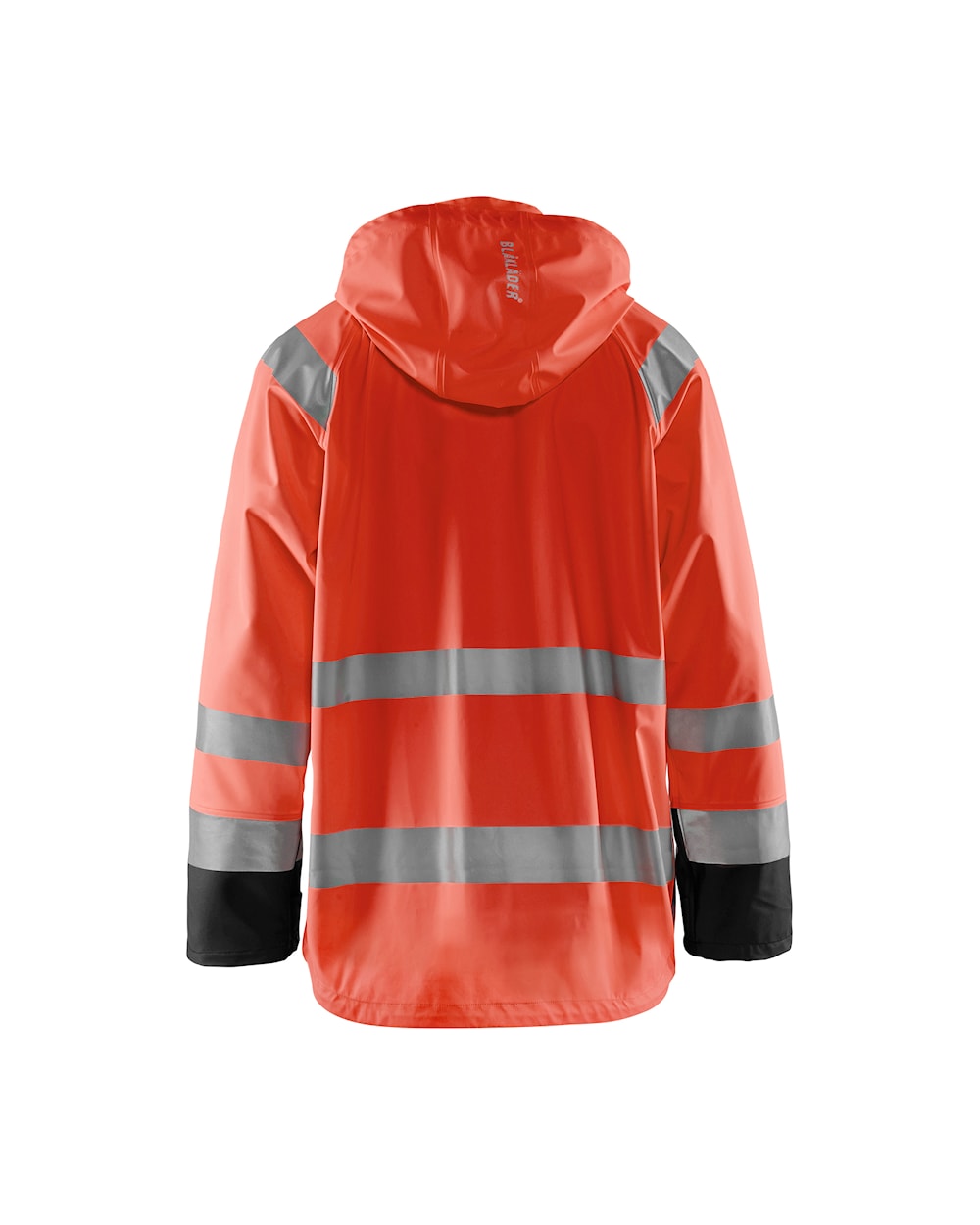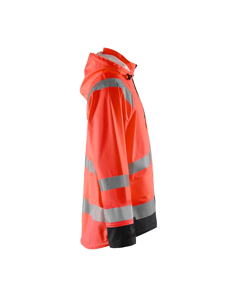 High Vis Regenjacke mit verlängertem Rücken. Diese leichte Regenjacke bietet hohe Sichtbarkeit am Arbeitsplatz wenn nasses Wetter und schlechte Sichtbarkeit die Arbeitsbedingungen erschweren. Das Material ist fest und haltbar und dennoch leicht, wind- und wasserdicht mit verschweißten Nähten. Die jacke hat einen verlängerten Rücken, einen einstellbaren Saum, leicht zugängliche Vordertaschen mit Patte und Ärmelbündchen mit Klettverschluss. Zertifiziert nach EN 343, Schutzkleidung gegen schlechtes Wetter und EN ISO 20471, Klasse 3, Schutzkleidung mit hoher Sichtbarkeit.Stoff