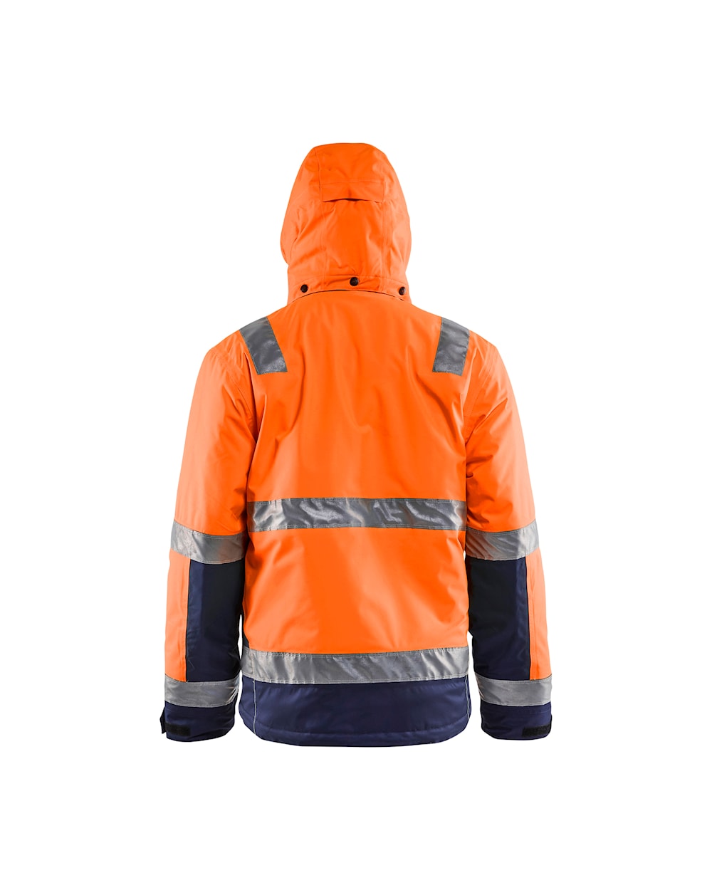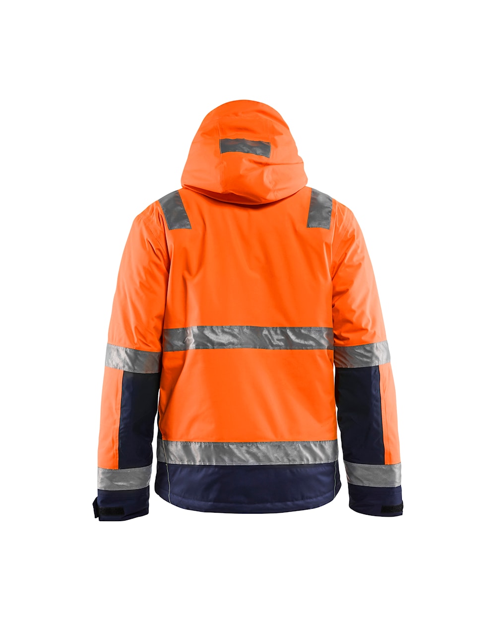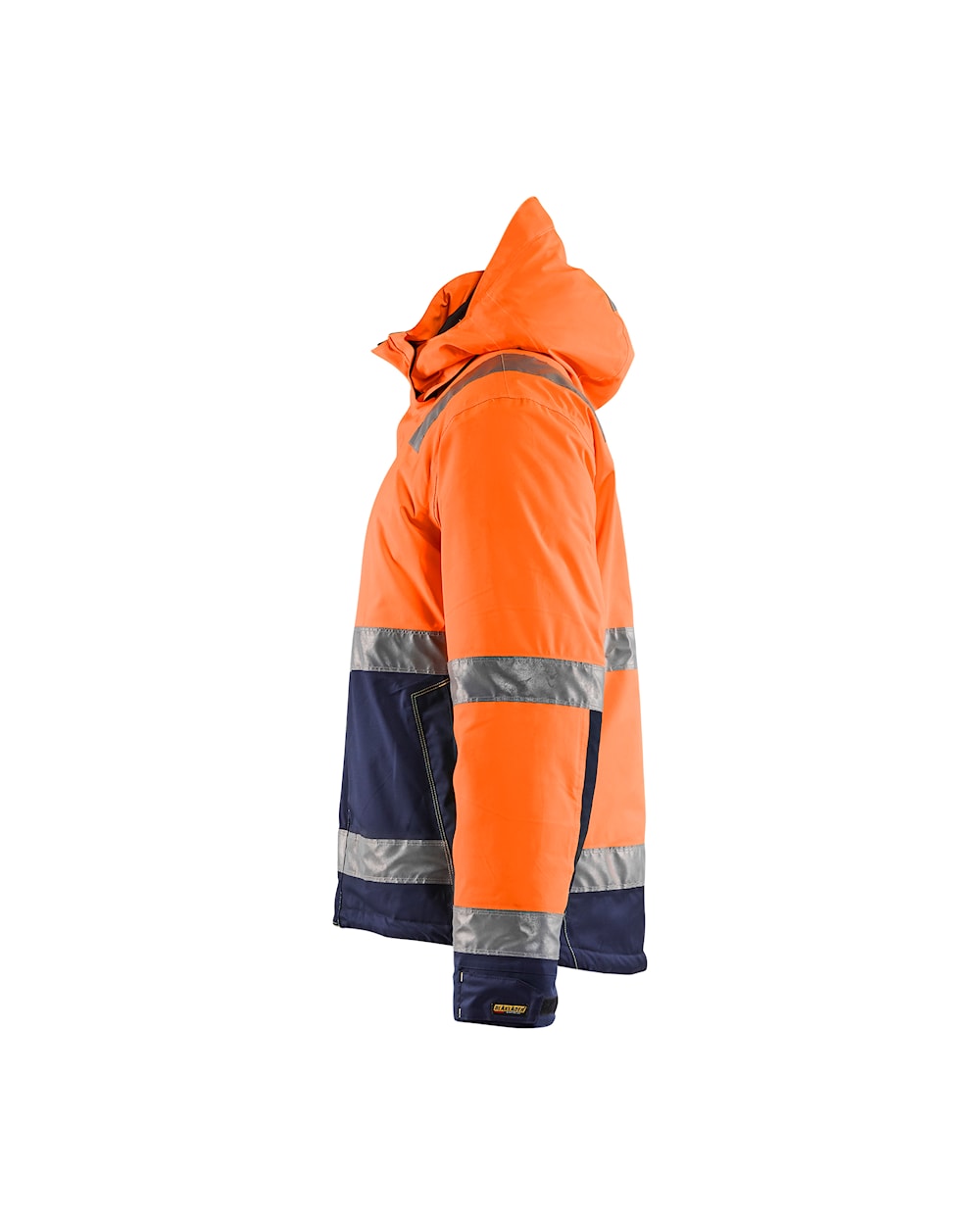 Hi-Vis-Winterjacke aus sehr strapazierfähigem, wind- und wasserdichtem sowie schmutzabweisendem Außenmaterial aus Stretch. Die Jacke verfügt über versiegelte Nähte und dunklere Farbfelder an den Stellen, die am meisten Schmutz ausgesetzt sind. Zu den geräumigen und praktischen Taschenlösungen gehören Fronttaschen, Brusttaschen mit Reißverschluss, Stifttasche und Handytasche sowie zwei Innentaschen, eine größere für z. B. Handschuhe und eine kleinere Tasche mit Velcro®-Verschluss.