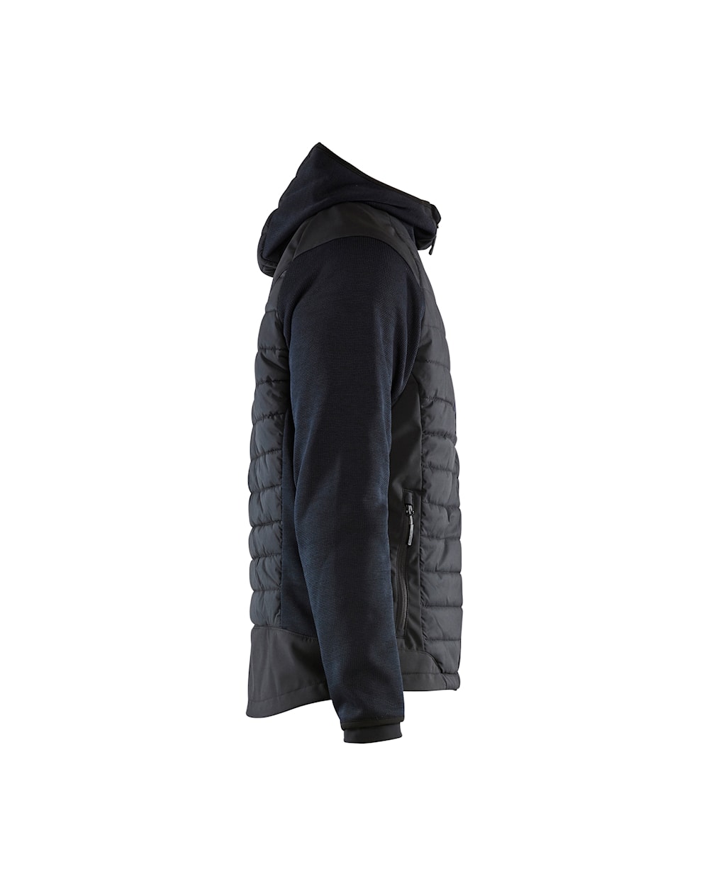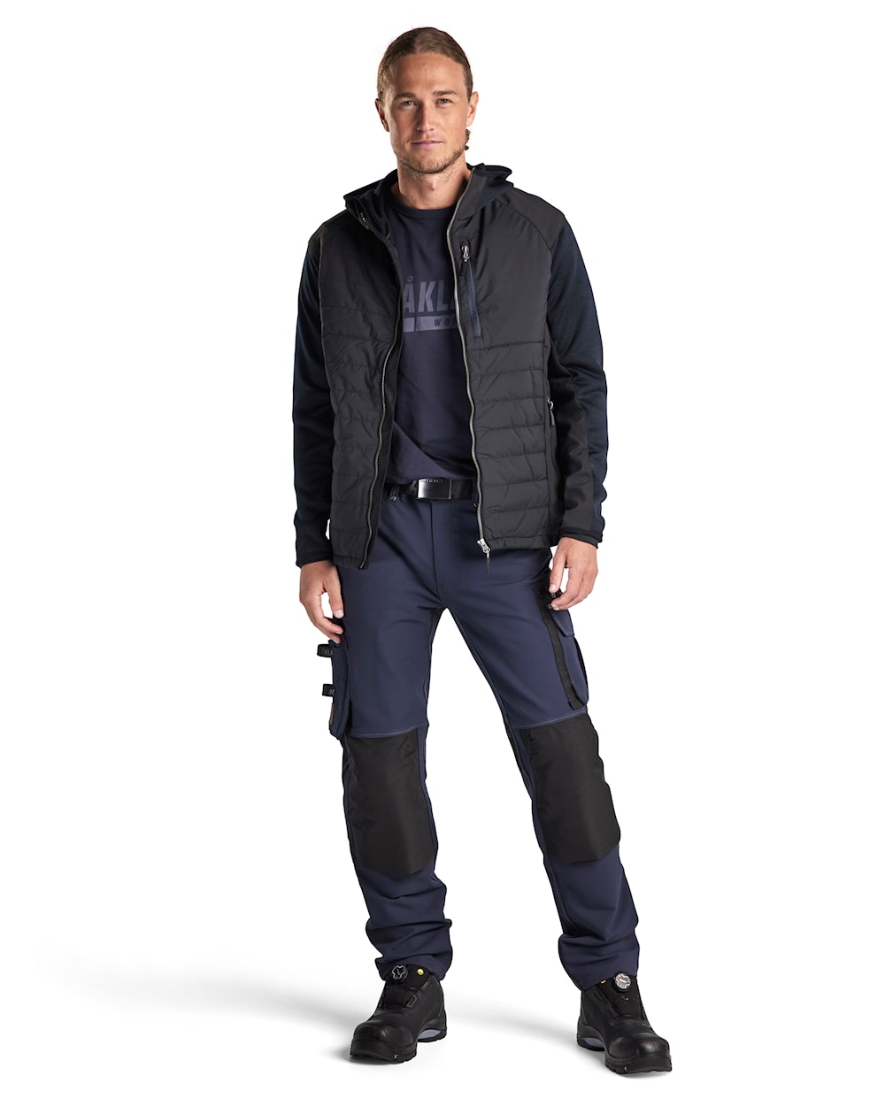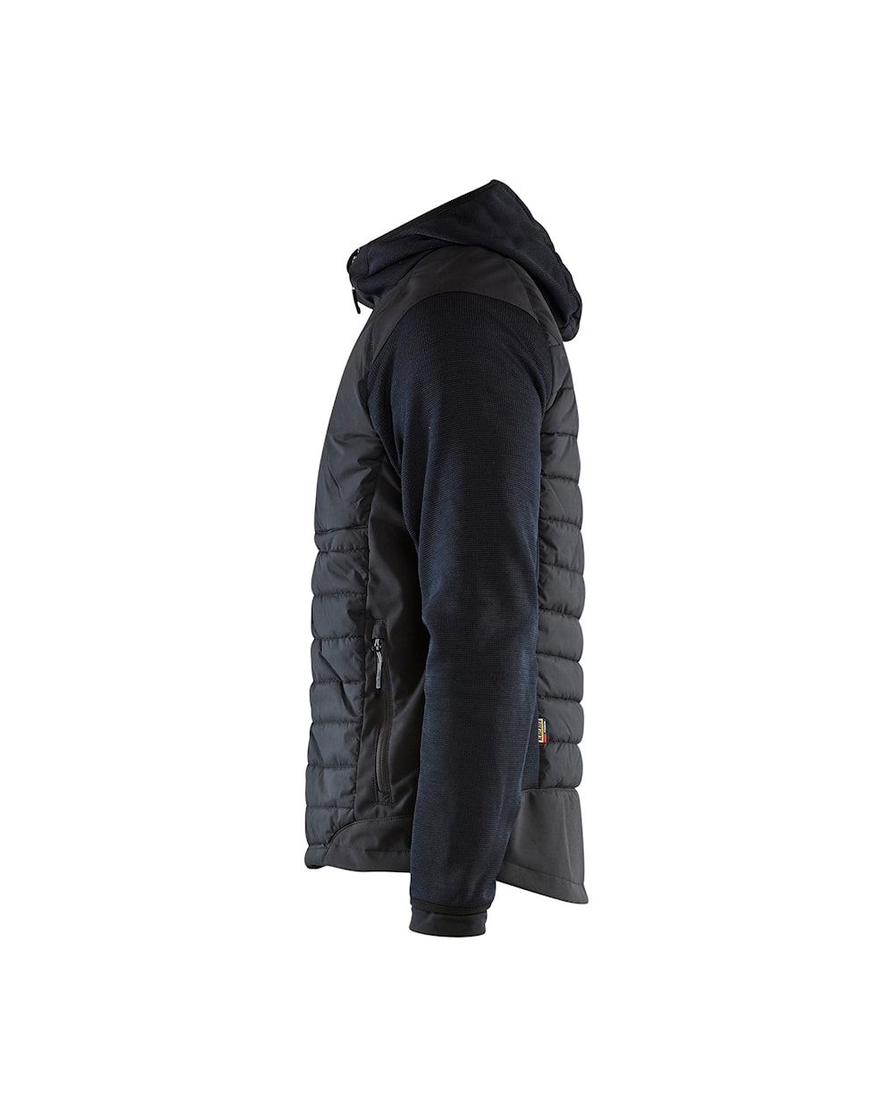 Eine Hybrid Jacke mit einer dünnen aber warmen Polsterung an Vorder- und Rückseite und an der Kapuze und Softshell Stoff an den Schultern, den Armen und den Seiten. Ein bequemes, warmes Kleidungsstück, das bei Arbeiten in kälteren Umgebungen eine ausgezeichnete Bewegungsfreiheit ermöglicht. Funktioniert genauso gut wie eine Jacke oder ein Pullover.