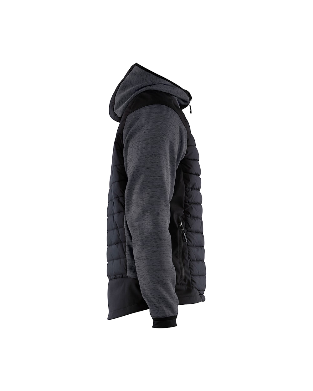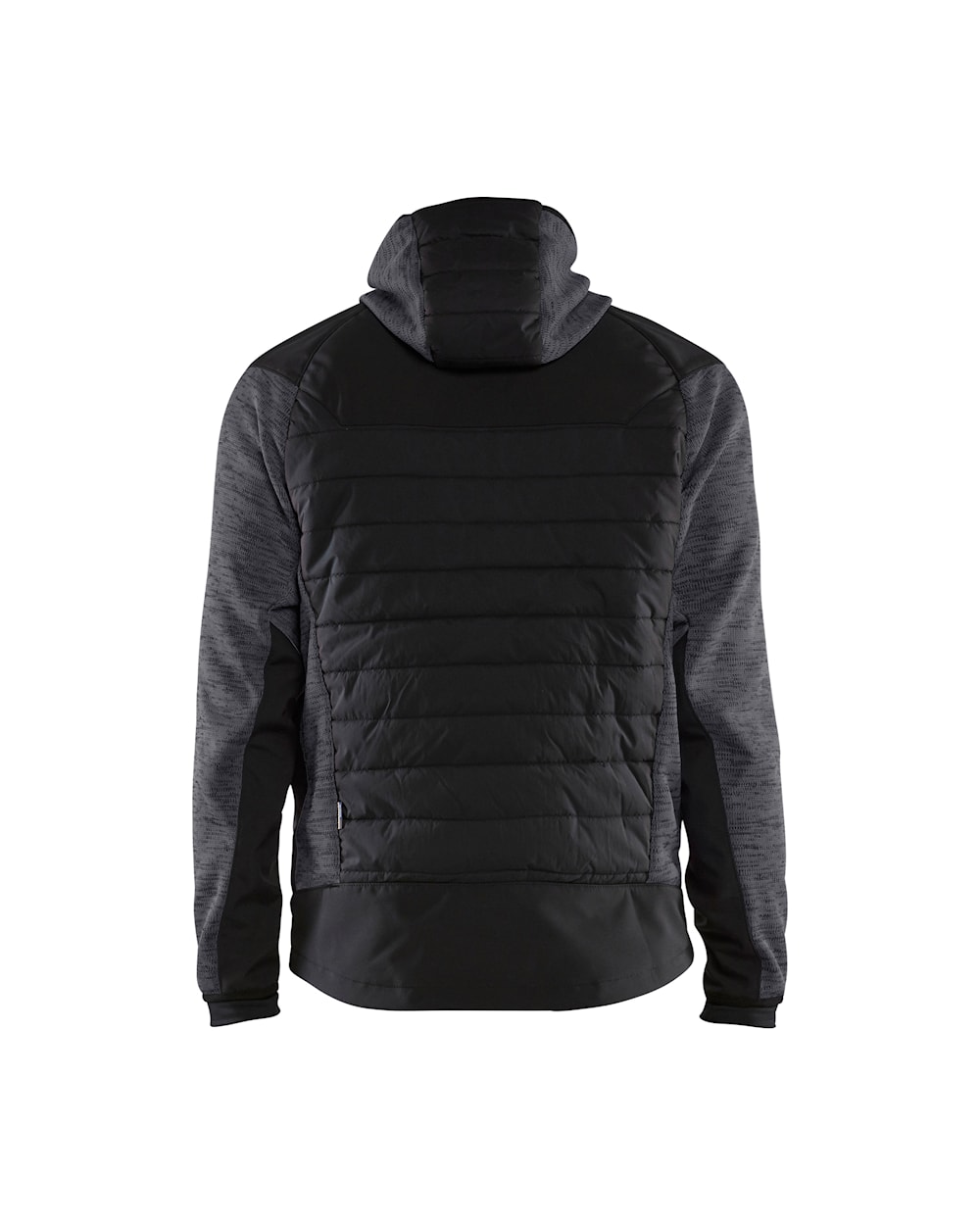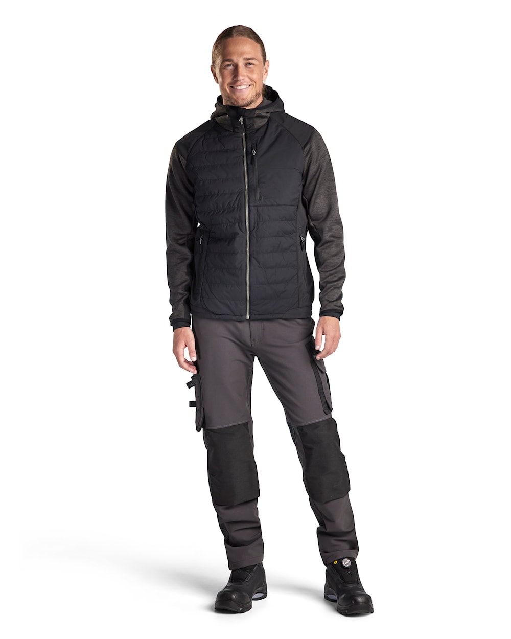 Eine Hybrid Jacke mit einer dünnen aber warmen Polsterung an Vorder- und Rückseite und an der Kapuze und Softshell Stoff an den Schultern, den Armen und den Seiten. Ein bequemes, warmes Kleidungsstück, das bei Arbeiten in kälteren Umgebungen eine ausgezeichnete Bewegungsfreiheit ermöglicht. Funktioniert genauso gut wie eine Jacke oder ein Pullover.