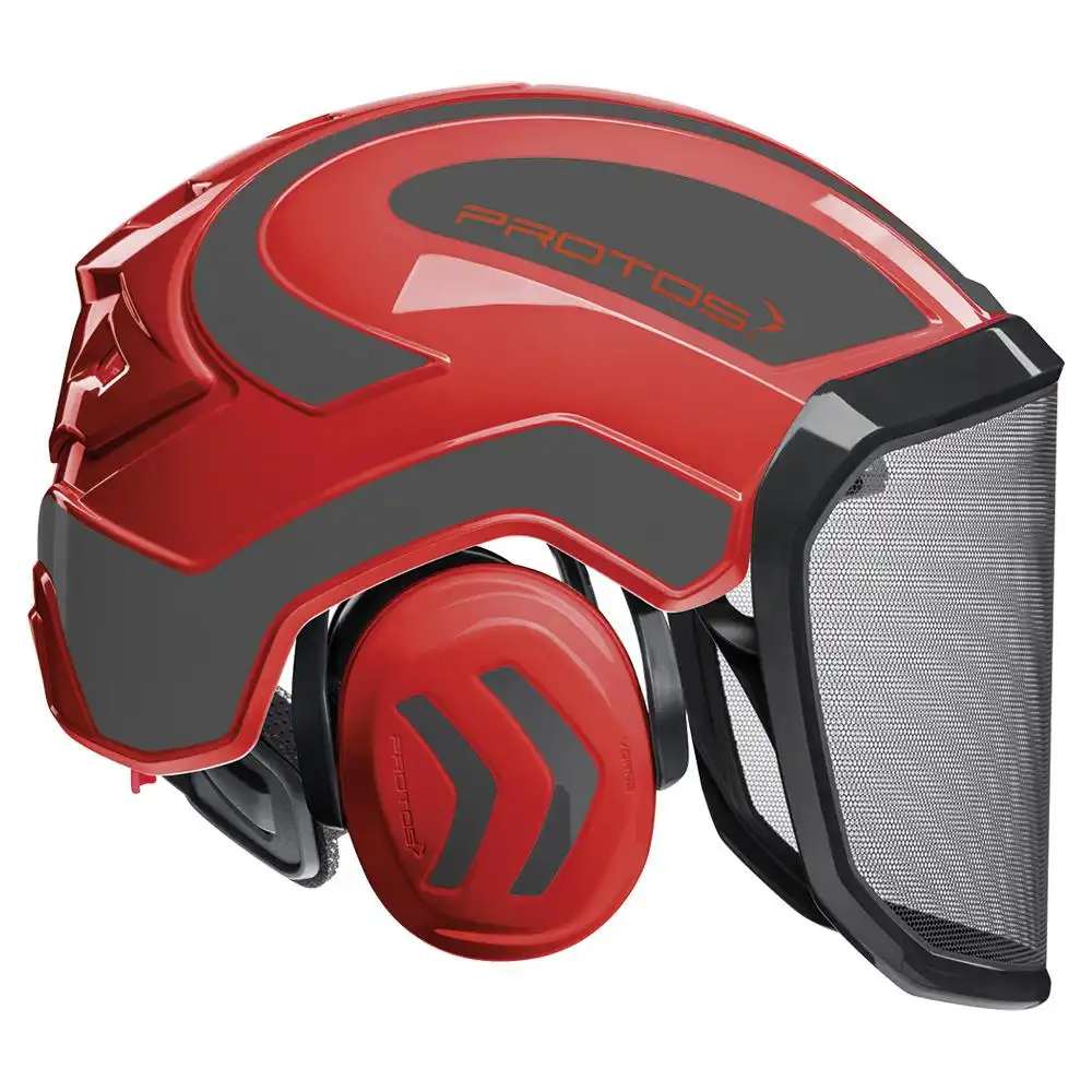 Der Forstschutzhelm "Protos Integral Forest" mit dem Visier G16 von PROTOS® bietet leichten, sicheren und effektiven Schutz für den Kopf im Forstbereich. Der Begriff "Integral" weist darauf hin, dass alle Komponenten in der Helmschale integriert sind, was ein Hängenbleiben an Ästen verhindert.