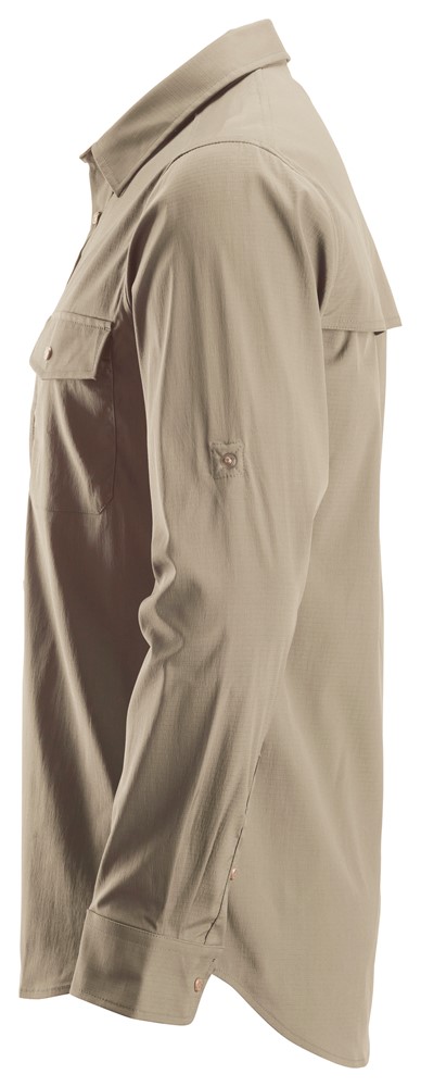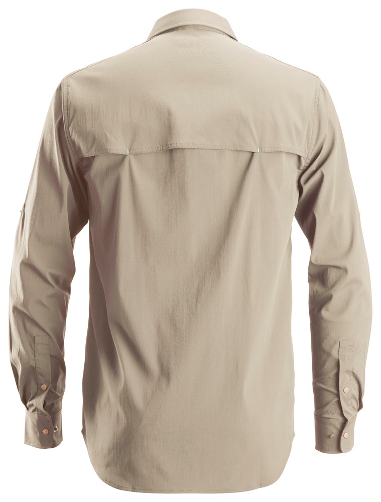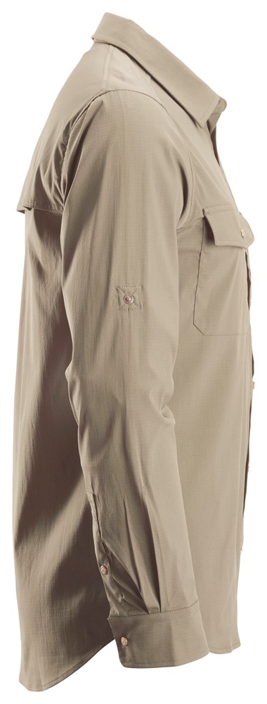 Leichtes Langarmhemd, das effiziente Atmungsaktivität für eine optimale Kühlung für Arbeiten bei Hitze im Freien bietet. Das Hemd besteht aus einer Mischung aus Nylon und Elastan. Das Material enthält Repreve, das aus recycelten PET-Flaschen hergestellt wird. Für eine verbesserte Belüftung ist das dehnbare Hemd hinten im Schulterbereich mit Mesh ausgestattet. Eine Pattentasche mit Knopf und eine verdeckte Reißverschlusstasche hinter der Pattentasche runden die Funktionalität ab. LSV 50+.