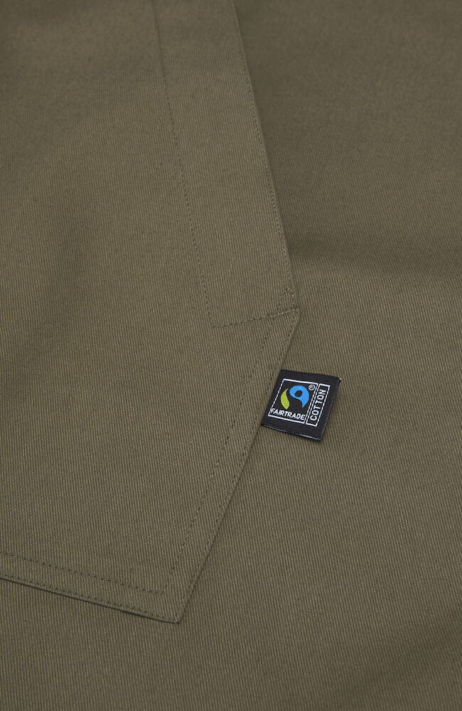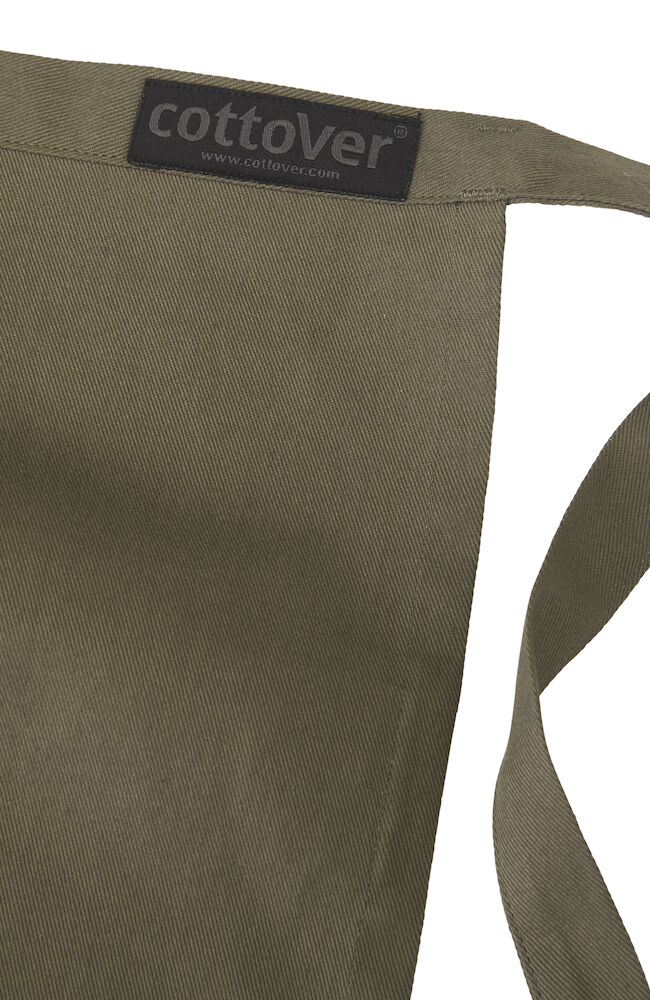 Kurze Bistroschürze mit Bindeband. Die aufgesetzte Fronttasche ist in der Mitte geteilt. Twill Version mit Ziernähten Ton in Ton, die Denim-Schürze hat gelbe Nähte