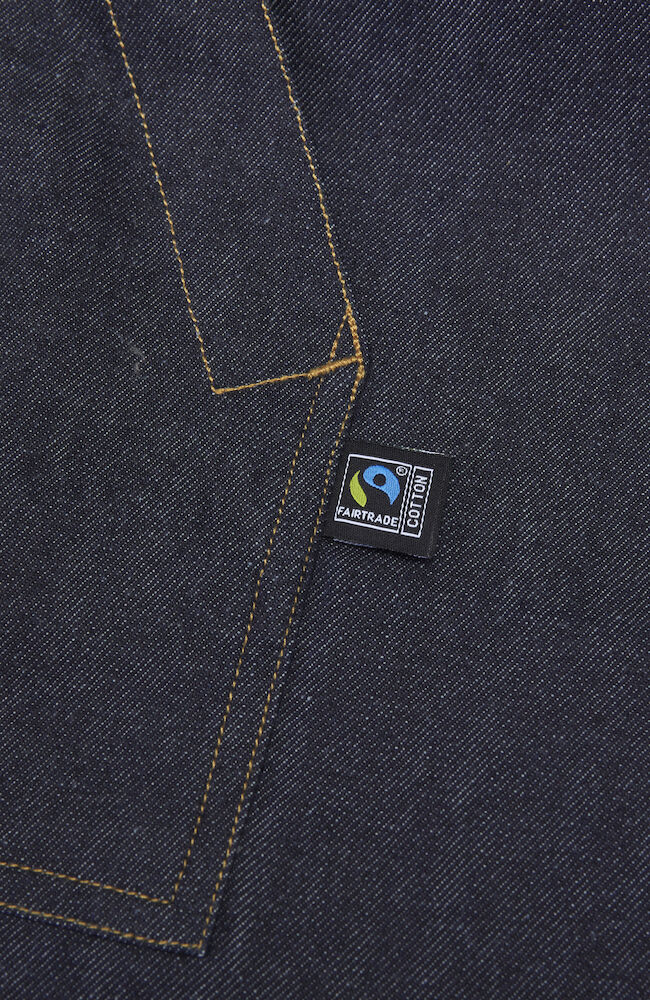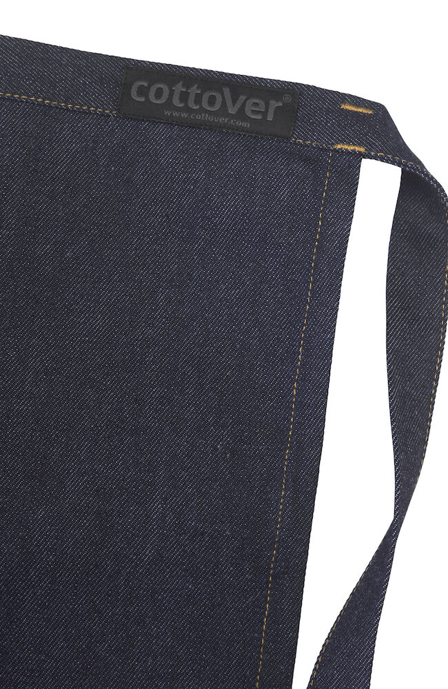 Kurze Bistroschürze mit Bindeband. Die aufgesetzte Fronttasche ist in der Mitte geteilt. Twill Version mit Ziernähten Ton in Ton, die Denim-Schürze hat gelbe Nähte
