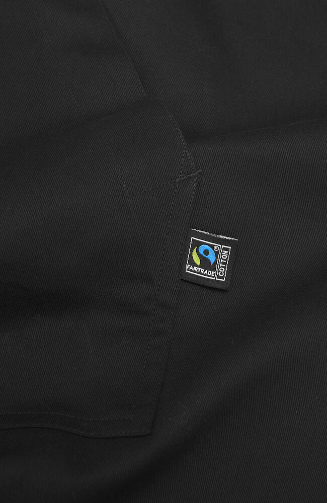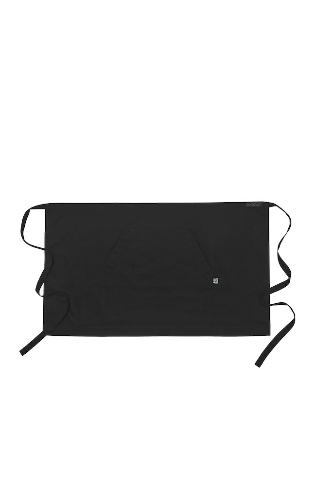 Kurze Bistroschürze mit Bindeband. Die aufgesetzte Fronttasche ist in der Mitte geteilt. Twill Version mit Ziernähten Ton in Ton, die Denim-Schürze hat gelbe Nähte